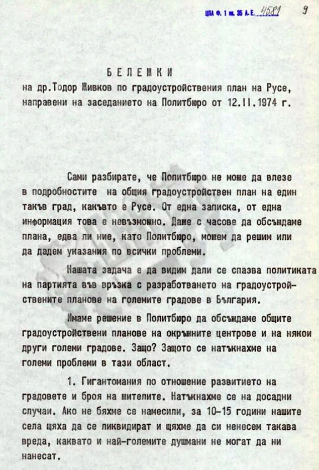 Политбюро на ЦК на БКП взема в свои ръце разглеждането и одобряването на градоустройствените планове на всички окръжни центрове и други по-големи градове в страната. Така на 12 февруари 1974 г. в най-висшия партиен орган се обсъжда градоустройственият план на Русе. Разгледани са становището на отдел „Строителство, архитектура и транспорт“ към ЦК на БКП и доклад до Политбюро за градоустройствения план на града, подписан от министъра на строежите и архитектурата Григор Стоичков, от първия секретар на ОК на БКП в Русе Петър Данаилов, както и от председателя на Изпълнителния комитет на Окръжния народен съвет Ангел Бобоков. Лично Тодор Живков пише свои съображения и еднолично налага мнението си по редица въпроси, касаещи плана.