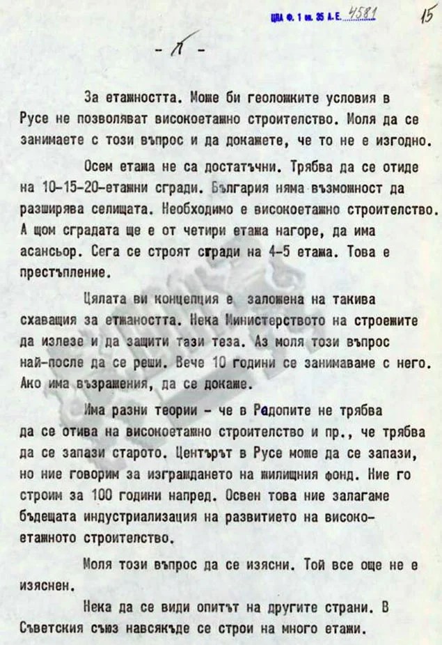 Визирайки градоустройствения план на Русе, Живков се спира на въпроса с високоетажното строителство. Въпреки че геоложките проучвания показват, че градът се намира върху много нестабилен льосов почвен слой и това не позволява изграждането на големи сгради, той удря по масата и настоява, че предвиденото масово строителство на осеметажни панелки не е достатъчно. „Трябва да се отиде на 10-15-20-етажни сгради“, диктува Живков.